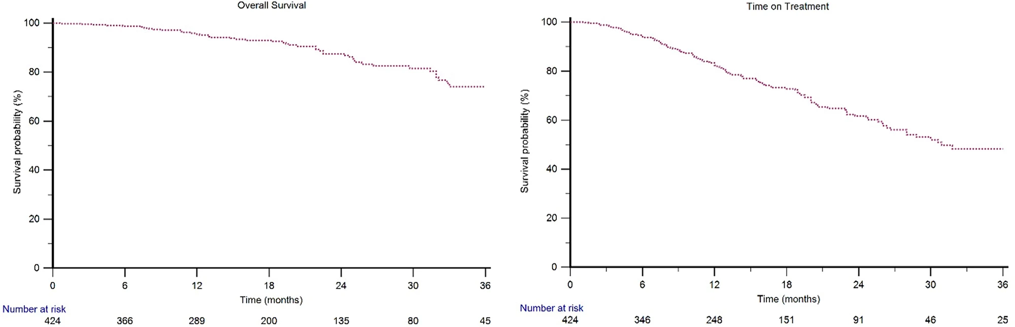 - Only 13% of patients (53 out of 424) had died at the time of analysis